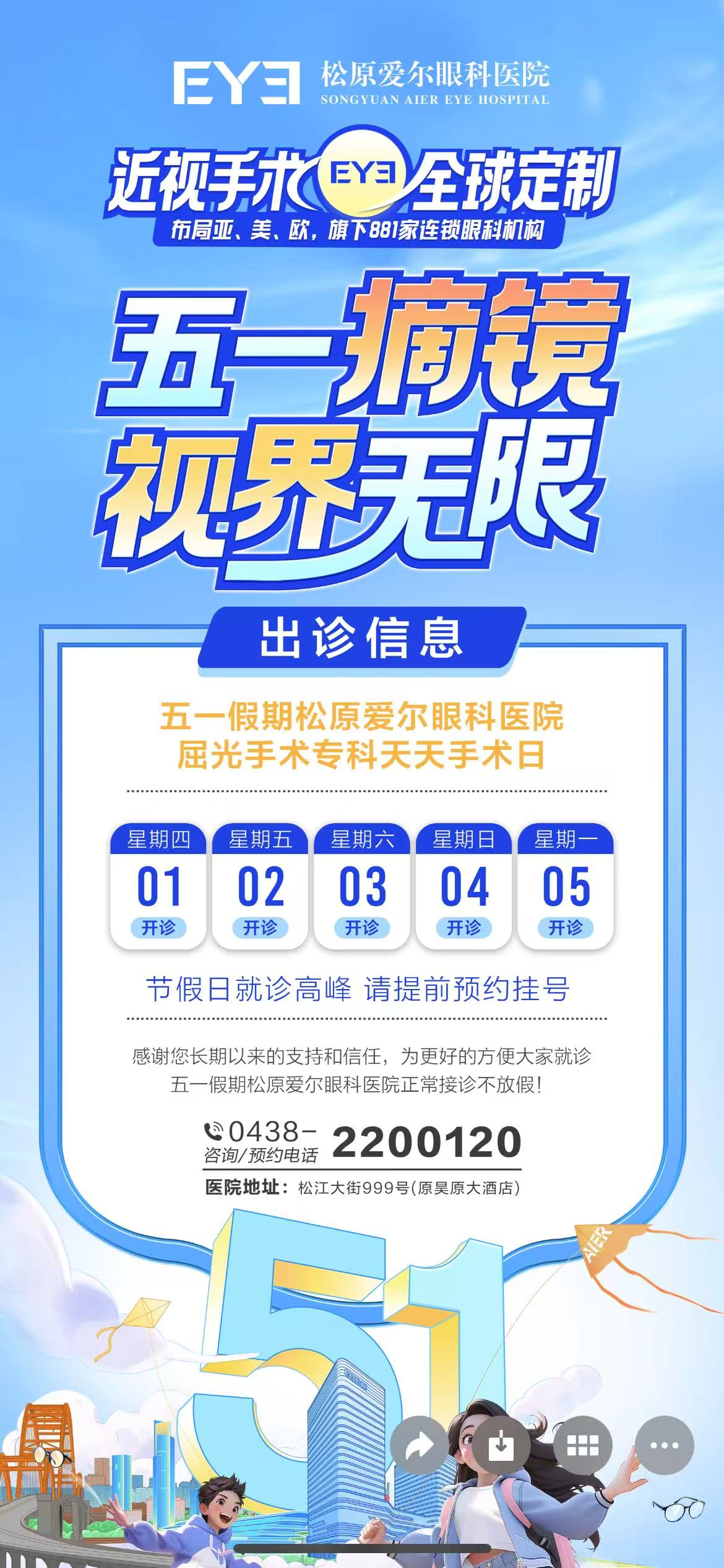 “五一”小長假即將來臨 大家是否已經(jīng)計劃好5天假期安排了呢 為更好的服務(wù)市民朋友的就診需求? 松原愛爾眼科醫(yī)院 五一假期正常接診 為您和家人的眼健康保駕護航 五一期間, 很多朋友都想好怎么過自己的“小長假”了 有些人準備趁著小長假出去玩一玩; 有些人則選擇宅在家好好放松一番; 無論是選擇“出去玩”還是“宅在家” 都要愛護好自己的眼睛哦! 假期出游護眼指南 〖控制電子產(chǎn)品使用時間〗 ? ? ?假期將至,相信很多朋友都會開啟「宅家」模式,手機、平板電腦不離手,玩游戲、追劇、刷短視頻。過度的使用電子產(chǎn)品會傷害眼睛,容易引發(fā)近視、干眼癥等疾病。因此,一定要控制好電子產(chǎn)品的使用時間,無論是連續(xù)使用時長還是總使用時長都要進行約束,每用眼40分鐘后進行遠眺、眨眼訓練或眼保健操等放松眼睛。 〖過敏體質(zhì)少接觸花草〗 〖外出注意眼部防曬〗 ? ? ?外出注意眼部防曬春夏季出門在外,要時刻注意防曬。如果不提防「強光」與「紫外線」,眼睛可能會出現(xiàn)疼痛、畏光、流淚、異物感、甚至有強烈的燒灼感和劇烈疼痛,導致視力下降,傷害到眼睛。而且,強烈的紫外線照射,還容易引發(fā)白內(nèi)障。所以,提醒出游的朋友們可以佩戴太陽鏡或太陽帽進行防護,以減少陽光對眼睛的照射,以免誘發(fā)眼部疾病。 〖避免異物入眼〗 ? ???戶外運動時,注意防止風沙或其他異物入眼,一旦發(fā)生,千萬不要隨便用手揉。如果此時用手揉眼睛,則有可能擦傷角膜或者結(jié)膜,導致眼睛受到傷害。